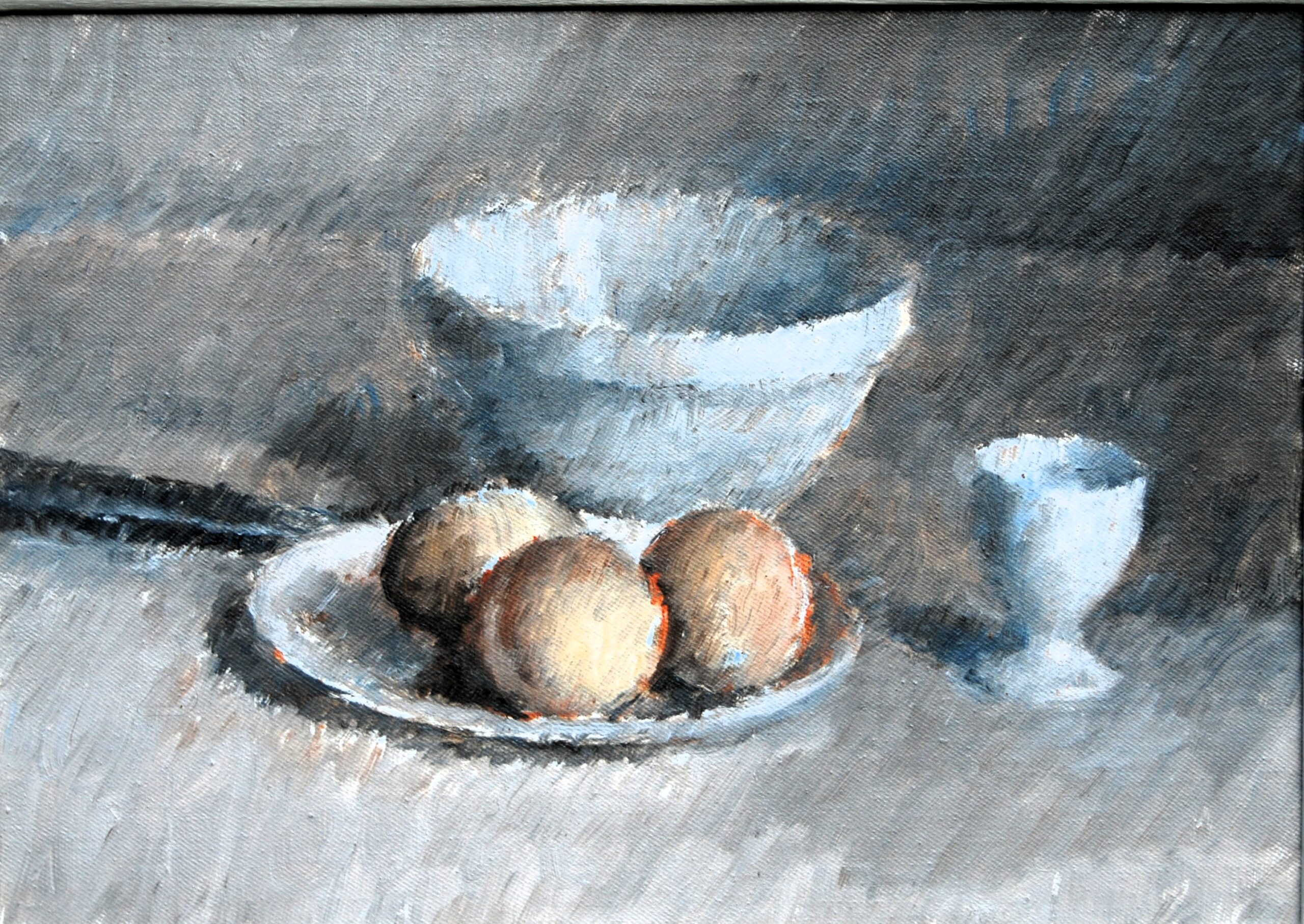 The paintings in this Exhibition were painted in oil on canvas from objects arranged on a table in an attempt to express form and spatial relationships.