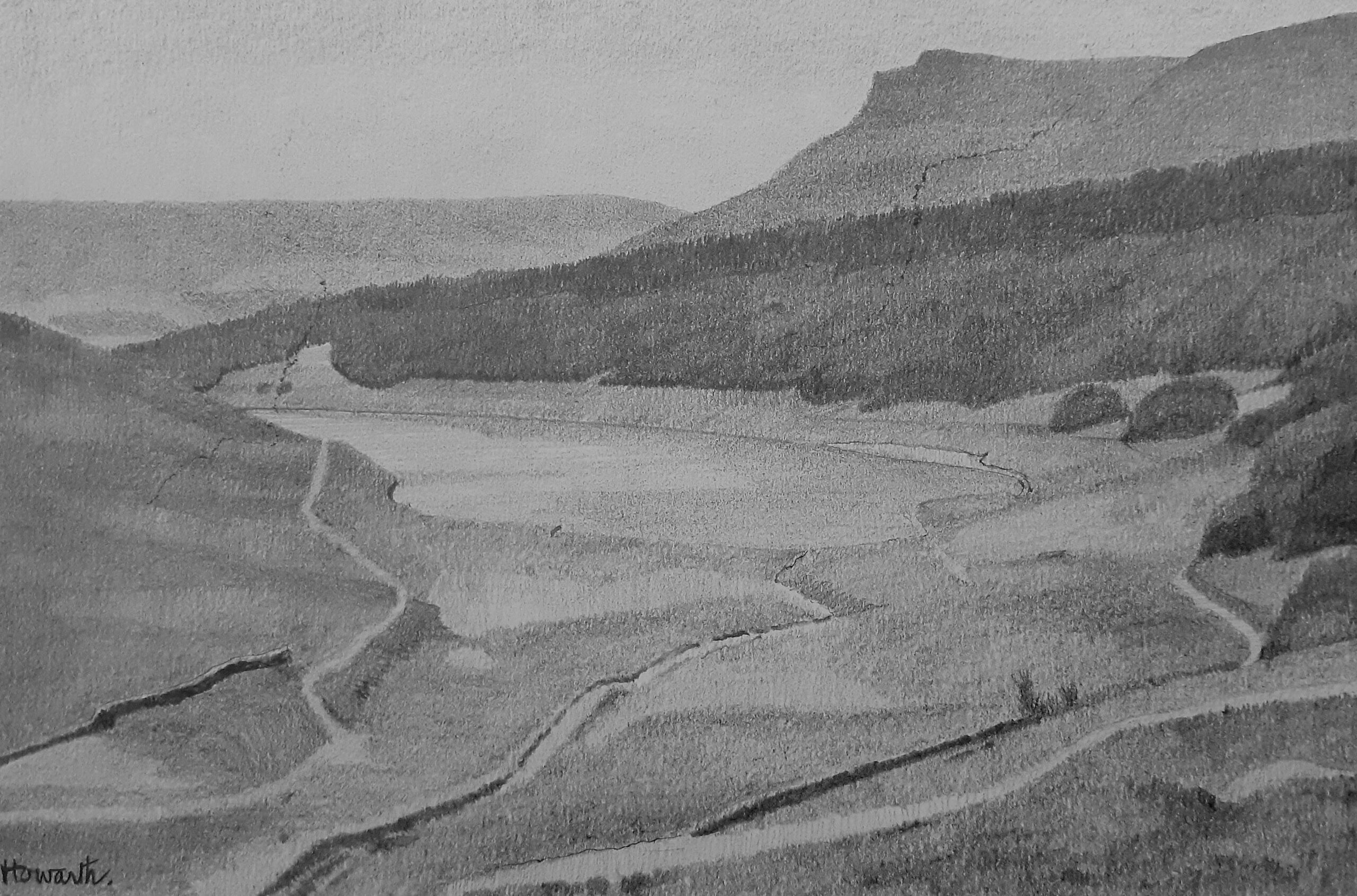 “Yeoman Hey Reservoir, Greenfield”, pencil, 20 (h) x 30 (w) cm. A signed original by Russel Howarth.
